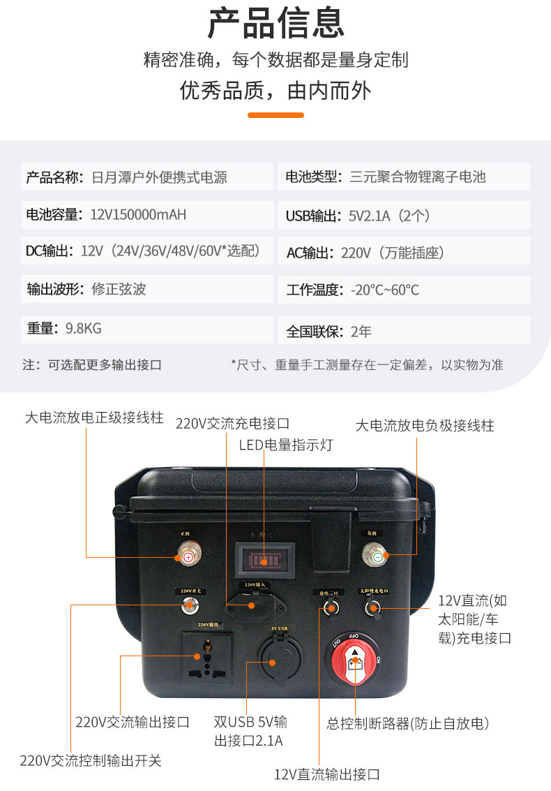 简单介绍:修正弦波 内置足容量锂电池 支持多功能充电,市电/太阳能/汽车均可充电,多功能接口,多种输出方式满足AC/DC/USB车充充电需求。兼容多种设备,适用于电脑、无...