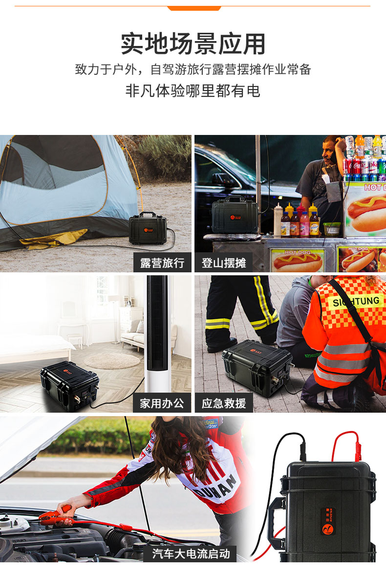修正弦波 内置足容量锂电池 支持多功能充电,市电/太阳能/汽车均可充电,多功能接口,多种输出方式满足AC/DC/USB车充充电需求。兼容多种设备,适用于电脑、无人机、房车、车载冰箱、户外露营,夜市摆摊等