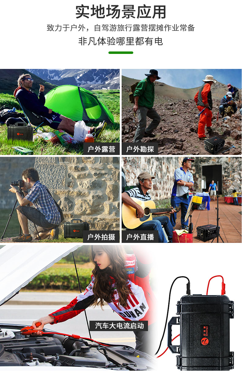 大容量修正弦波输出,支持太阳能、汽车充电,超长续航AC/DC/USB多种充电模式。适用于电脑、无人机、房车、车载冰箱、户外露营,夜市摆摊等